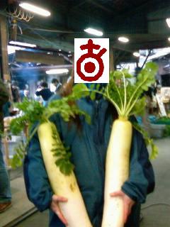 今日は今年一回目の大原朝市で初売りでした。6時半に到着しましたが、まだ薄暗く寒い中、たくさんのお客さんが来ていて毎回の事ながら「すごいなぁ~」と思いました。 今日も色々買いました。なかでも志野さんと言うお店でとても立派なお野菜があって、あまりにも立派だったので一枚カメラで撮ってもらいました。スゴイでしょう?ずっと持ってると腕の感覚がおかしくなりそうなくらいにずっしりしてましたよ 。 あとその他で変わったお野菜では、また違うお店ですが「ふし高菜」と言うお野菜で、おばちゃんが「炊いても美味しいよ」と言ってたので今日おむら家でさっそく、おあげさんと炊こうと思います。まだまだ大原の朝市では私達の知らない野菜や京都の昔からある食べ物がたっくさ~んありますのでまたお伝えしますね。