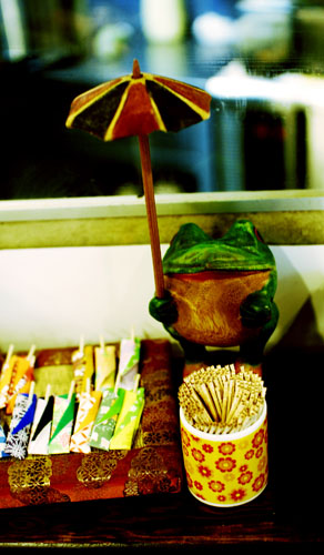 写真はおむらはうすのカウンターに居る木製のカエルです。このカエルの横に置いてある千代紙で作った爪楊枝入れ、結構人気です。よろしければお持ち帰り下さい。