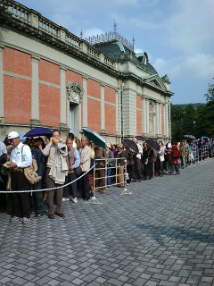 博物館の敷地に入ると行列ができていました。京都だけの開催で他の都市では開催しないしことと観光シーズンが重なって平日にも拘らず凄い人でした。もっとも、係員が「土日はこの2倍程の混雑です」といっていたのでその半分の混雑と思えばラッキーと言えなくはないです。